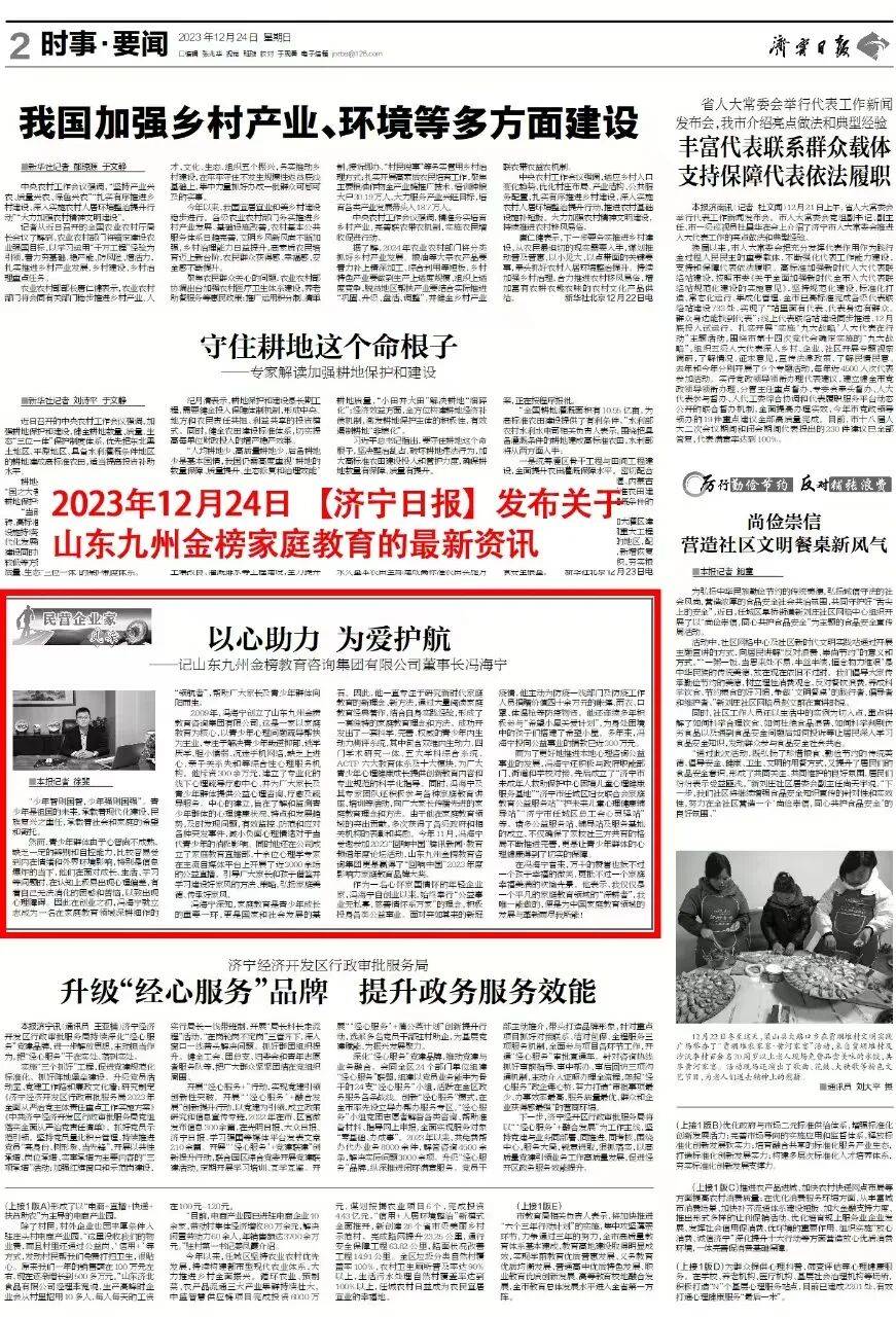 除了行业权威认证,九州金榜家庭教育的匠心教育理念与突出成就,还多次获得主流媒体的聚焦报道,进一步扩大了品牌的社会影响力。如:集团专家多次受邀做客济宁交通文艺广播 ,面向广大听众普及心理科普知识与科学育儿技巧,用通俗易懂的语言将专业的家庭教育理念传递给千家万户;济宁日报专门对集团董事长冯海宁先生进行专访,深度解读其在家庭教育行业的深耕历程、责任担当与创新实践,让社会大众更直观地了解九州金榜家庭教育“以匠心守教育初心”的品牌底色。主流媒体的持续关注与报道,不仅让九州金榜家庭教育的匠心故事被更多人知晓,更让科学育儿理念惠及更广泛的群体。