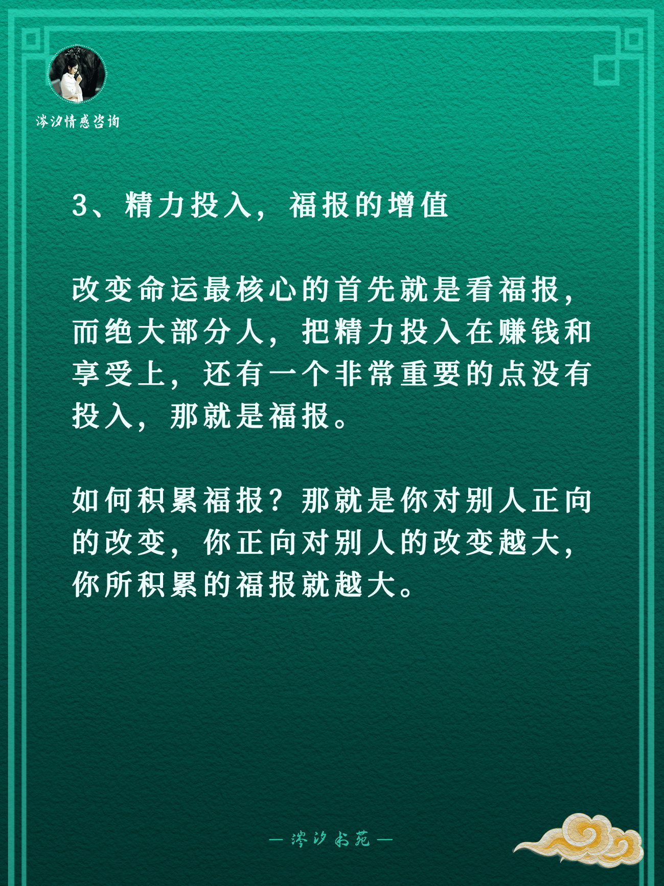 3、精力投入,福报的增值 改变命运最核心的首先就是看福报,而绝大部分人,把精力投入在赚钱和享受上,还有一个非常重要的点没有投入,那就是福报。 如何积累福报?那就是你对别人正向的改变,你正向对别人的改变越大,你所积累的福报就越大。