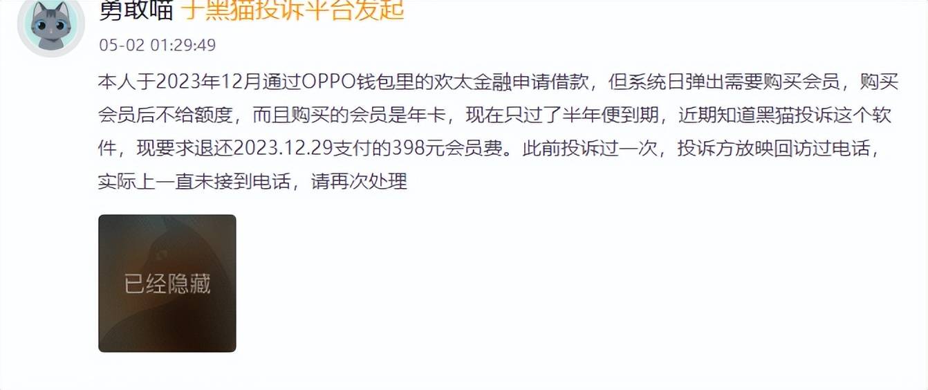 5月2日,一位借款人投诉称通过oppo钱包里的欢太金融申请借款,系统弹出需要购买会员,购买会员后不给额度,而且购买的会员是年卡,只过了半年便到期,等于是花了398元买了个寂寞。