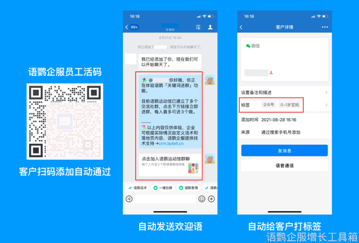 除了更换员工外,客户扫描员工活码后,可自动通过好友,并发送个性化欢迎语,自动打渠道标签,帮助企业实现客户精细化运营。