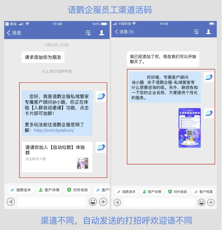 通过语鹦企服员工活码给不同渠道来源的客户,自动发送不同内容的欢迎语或见面礼,除了欢迎语,也支持发放优惠券、入群邀请链接等,方便企业进行后续的沟通和转化。