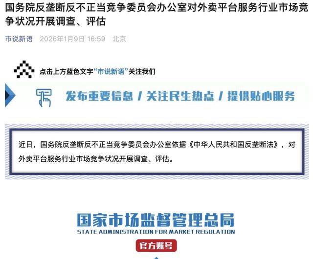 但就在次日,市场监管总局官方微信号发布信息,国务院反垄断反不正当竞争委员会办公室依据《中华人民共和国反垄断法》,对外卖平台服务行业市场竞争状况开展调查、评估。