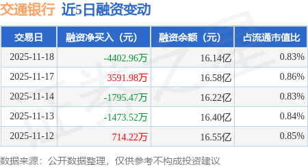证券之星消息,11月18日,交通银行(601328)融资买入6836.01万元,融资偿还1.12亿元,融资净卖出4402.96万元,融资余额16.14亿元。