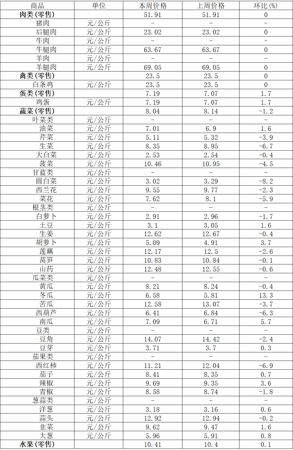 根据赤峰市生活必需品市场监测系统显示,上周1月5日—年1月11日)全市生活必需品市场总体运行平稳,供应充足。其中:鸡蛋、水果零售均价与前一周相比(下称环比)上涨,蔬菜零售均价环比下降,粮食、食用油、肉类、白条鸡、奶制品零售均价环比持平。具体情况如下: