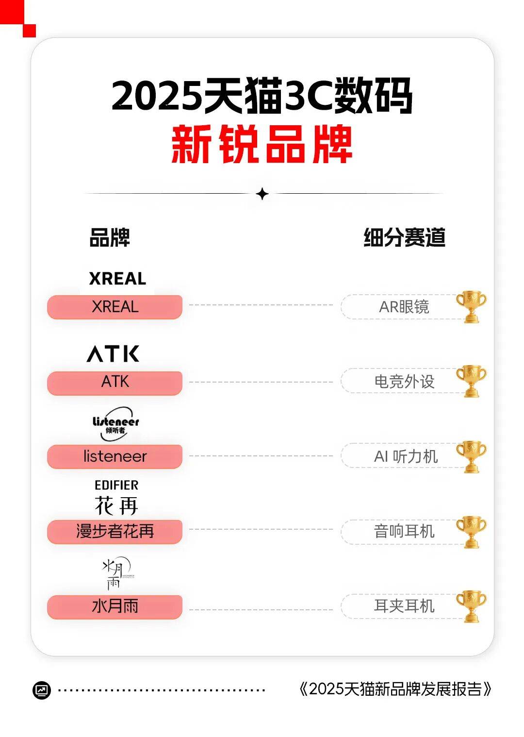在榜单里,我们还看到了在古法黄金赛道中展现出国际化野心的「君佩」,凭借极致产品力吸引科技博主自发评测的 3C品牌「酷态科」,主打重组胶原蛋白成分,两个月在天猫实现从 0 到 1 突破的「同频」。