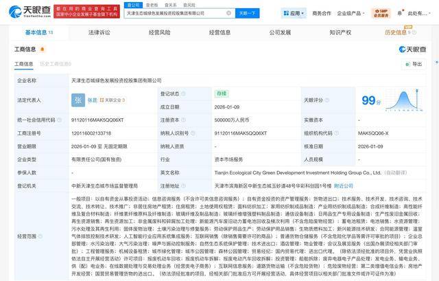 天眼查工商信息显示,近日,天津生态城绿色发展投资控股集团有限公司成立,法定代表人为张昆,注册资本50亿人民币,经营范围含以自有资金从事投资活动、信息咨询服务、自有资金投资的资产管理服务、非居住房地产租赁、再生资源加工、人工智能行业应用系统集成服务、互联网销售等。股东信息显示,该公司由中新天津生态城管理委员会全资持股。