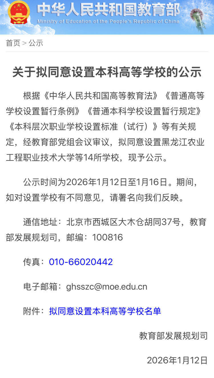 1月12日,教育部公布关于拟同意设置本科高等学校的公示,拟同意设置黑龙江农业工程职业技术大学等14所学校。其中,重庆三峡学院将更名为重庆三峡科技大学。