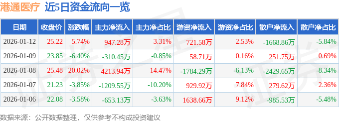 证券之星消息,截至2026年1月12日收盘,港通医疗(301515)报收于25.22元,上涨5.74%,换手率17.69%,成交量11.6万手,成交额2.86亿元。