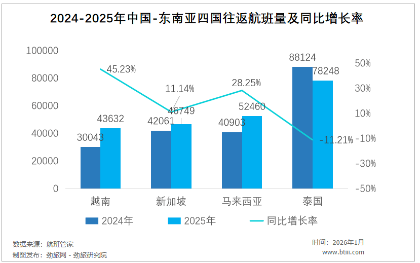 然而2025年中越往返航班量却直线上升,从3万班次猛增至4.3万班次,同比暴涨45.23%,险些追平新加坡(46749班次)、直逼马来西亚(52460班次),与泰国(78248班次)的差距大幅缩小。