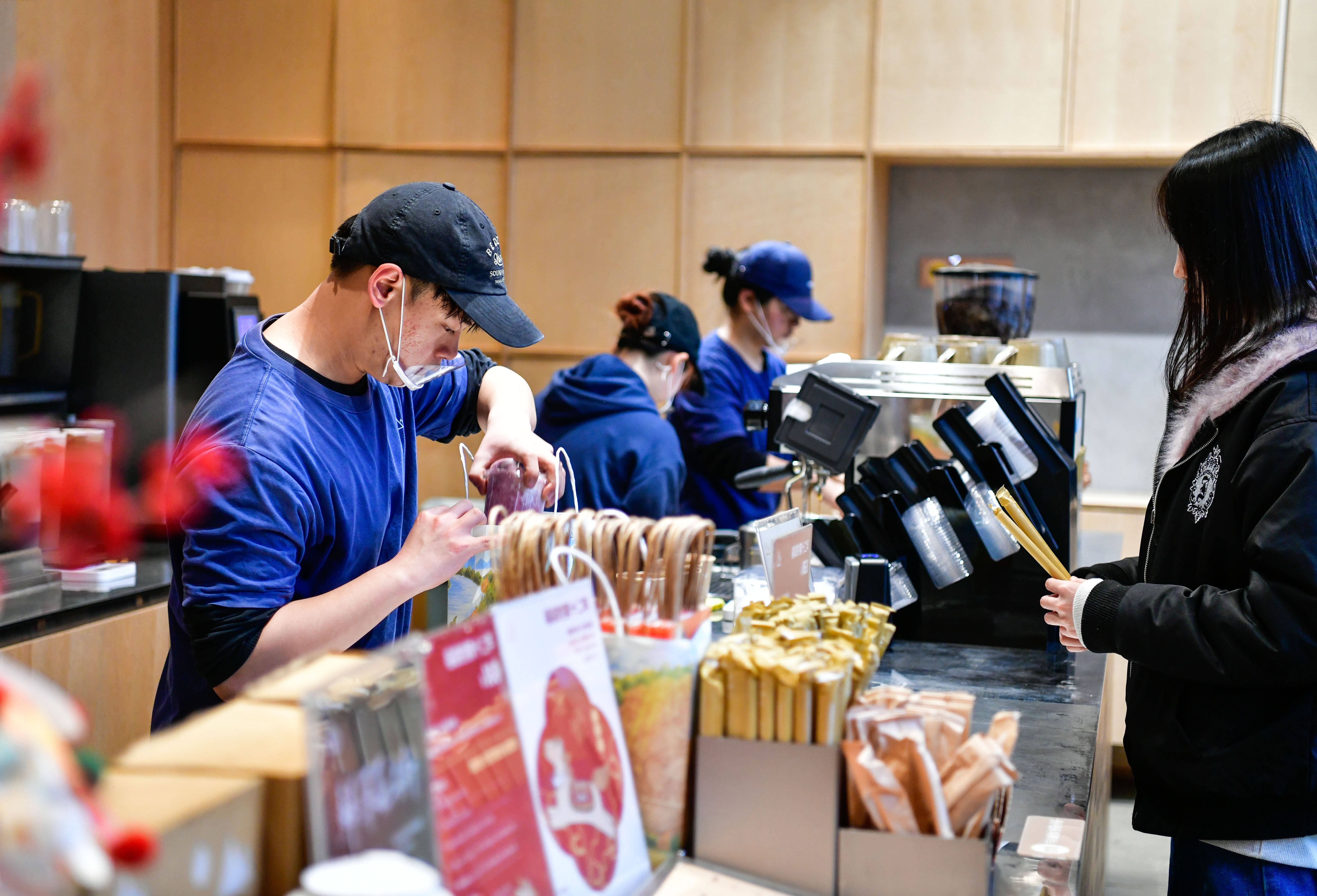 贵阳市云岩区友谊路“去茶山”饮品店的员工在给顾客打包新茶饮(2025年12月23日摄)。 新华社记者 杨文斌 摄