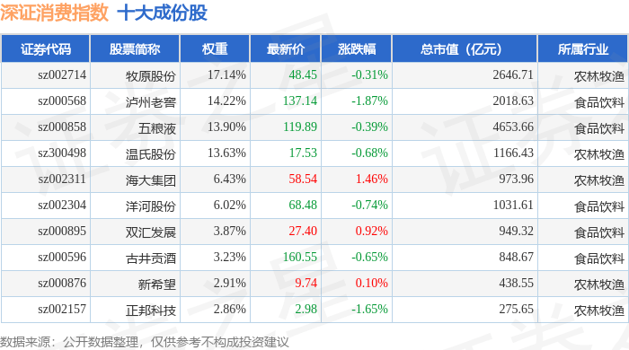 证券之星消息,11月19日,深证消费(399617)指数报收于9823.36点,跌0.52%,成交72.35亿元,换手率0.86%。当日该指数成份股中,上涨的有7家,海大集团以1.46%的涨幅领涨,下跌的有13家,新诺威以2.33%的跌幅领跌。