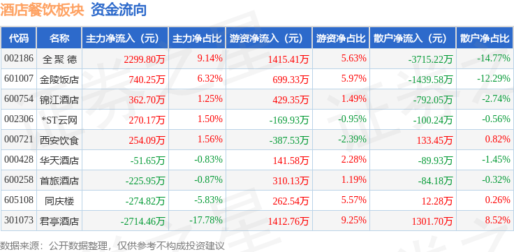 从资金流向上来看,当日酒店餐饮板块主力资金净流入660.14万元,游资资金净流入4113.63万元,散户资金净流出4773.77万元。酒店餐饮板块个股资金流向见下表: