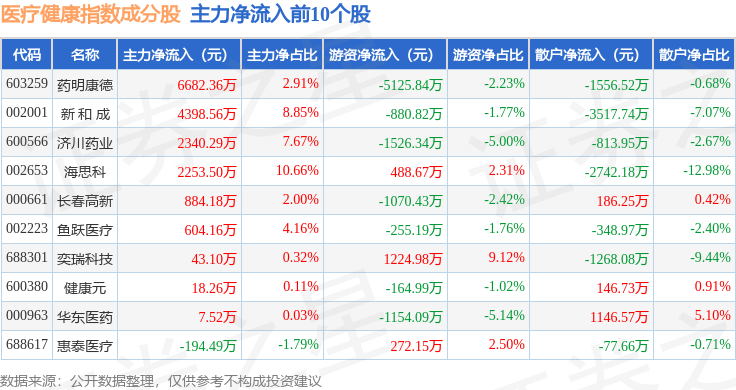 资金流向方面,医疗健康(980016)指数成份股当日主力资金净流出合计13.98亿元,游资资金净流入合计1.23亿元,散户资金净流入合计12.75亿元。成份股资金流向详情见下表: