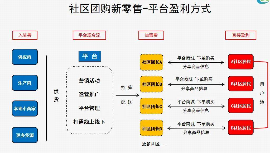 线上建立社群,平台商城内直接下单完成支付,平台统一收款分佣,并提供物流服务及售后支持。平台整合所有订单后,以社区点为单位统一发货单,进行配货及备货。配送员再统一配送至社区点,流程简单高效。此外,平台还提供多种盈利模式参考,如招募商家、社区店等,并增加会员玩法,丰富平台内容。