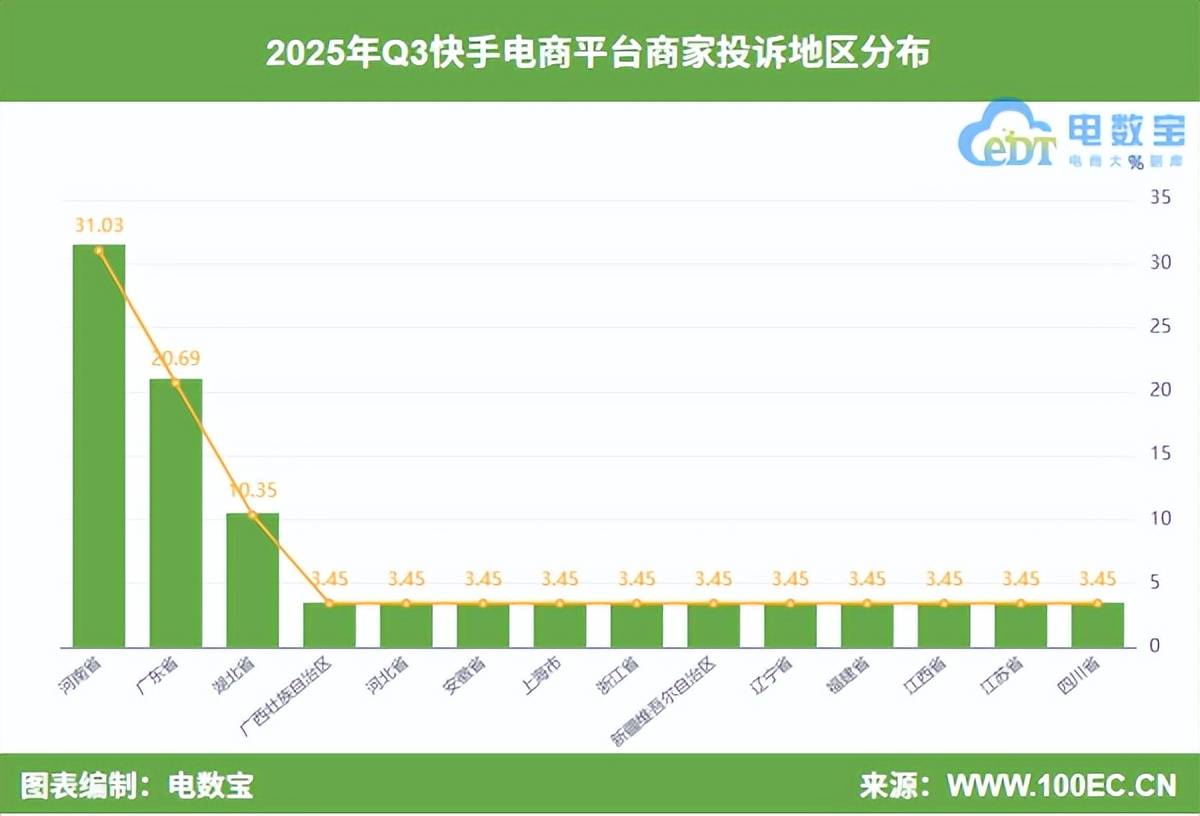 Q3,投诉快手电商平台的商家注册地区TOP3依次为河南省(31.03%)、广东省(20.69%)、湖北省(10.35%)。