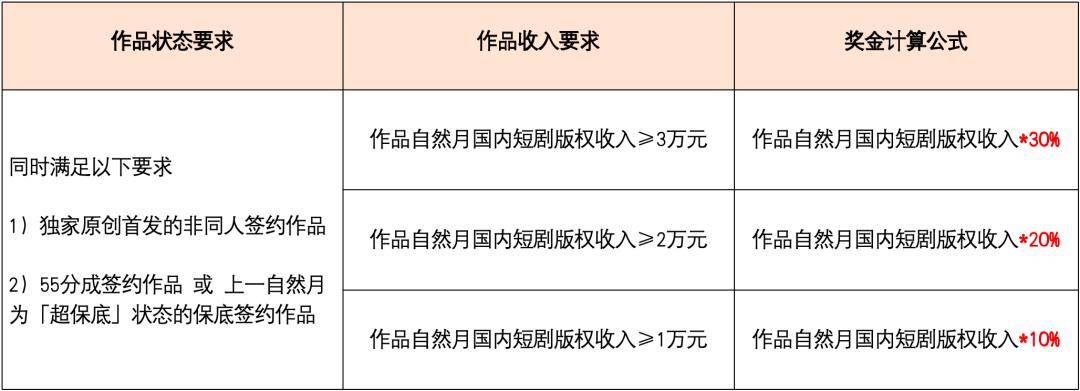 前者旨在嘉奖现象级短剧爆款背后的原著作品,为作者提供高达50万元至300万元的版权奖励。后者则面向更广泛的作者群体,分梯度地予以激励,只要作品自然月国内短剧版权收入达到1万元、2万元、3万元,就分别能给作者额外带来10%、20%、30%比例的版权收入奖金。