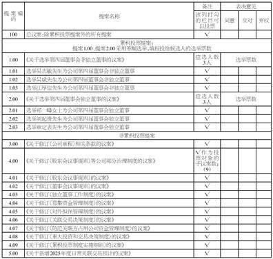 3、提案1.00、提案2.00为以累计投票方式分别选举非独立董事及独立董事,应选非独立董事3名,应选独立董事3名,股东所拥有的选举票数为其所持有表决权的股份数量乘以应选人数,股东可以将所拥有的选举票数以应选人数为限在候选人中任意分配(可以投出零票),但总数不得超过其拥有的选举票数。其中,独立董事候选人的任职资格和独立性尚需经深圳证券交易所备案审核无异议,股东会方可进行表决。