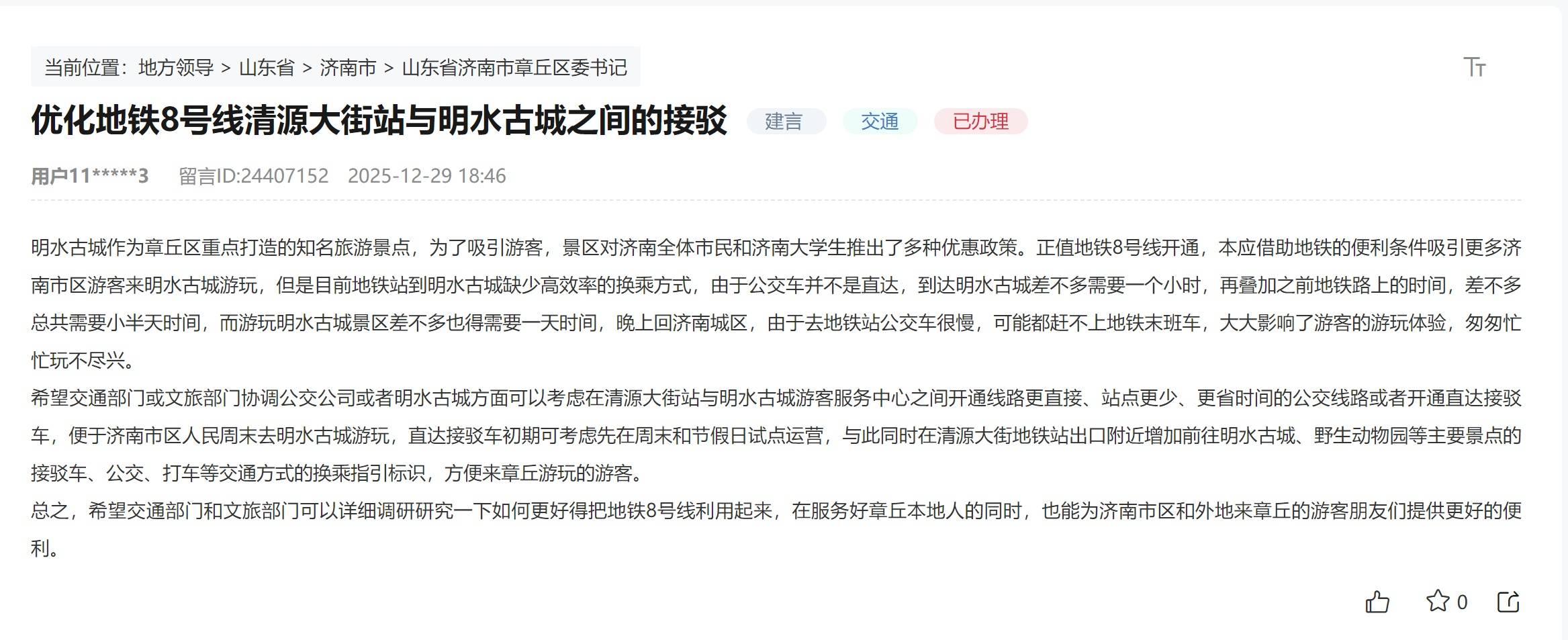 网友建议交通或文旅部门能够协调开通更直接、更省时的接驳专线,例如在周末与节假日试点运营直达接驳车,同时在清源大街站出口增设前往明水古城、野生动物园等主要景点的换乘指引标识。