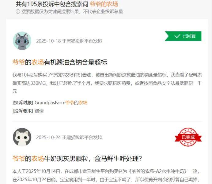 同时,爷爷的农场食安问题频发。黑猫投诉平台,关于“爷爷的农场”的投诉达 195 条,问题涉及产品里有异物、变质,还有生产线混用等争议。