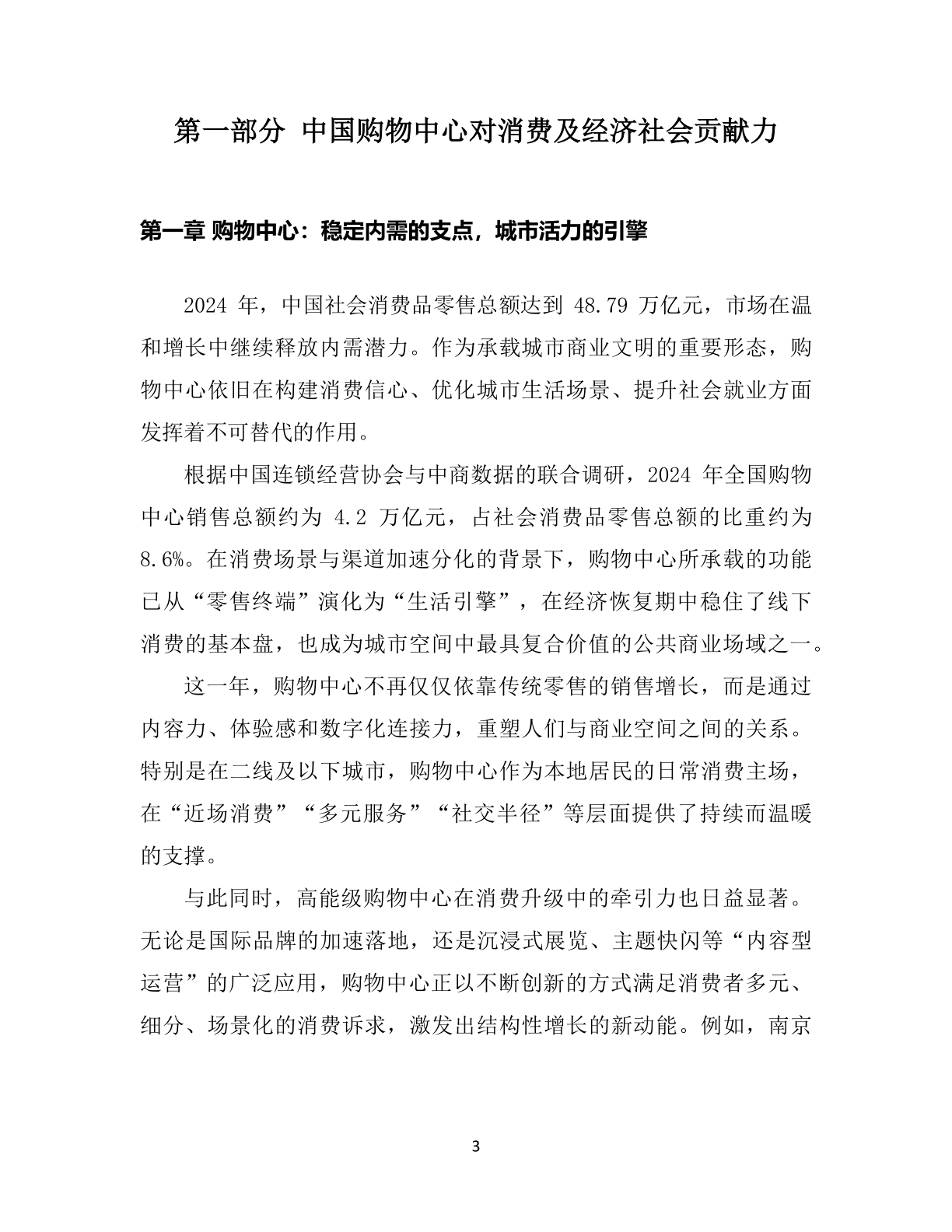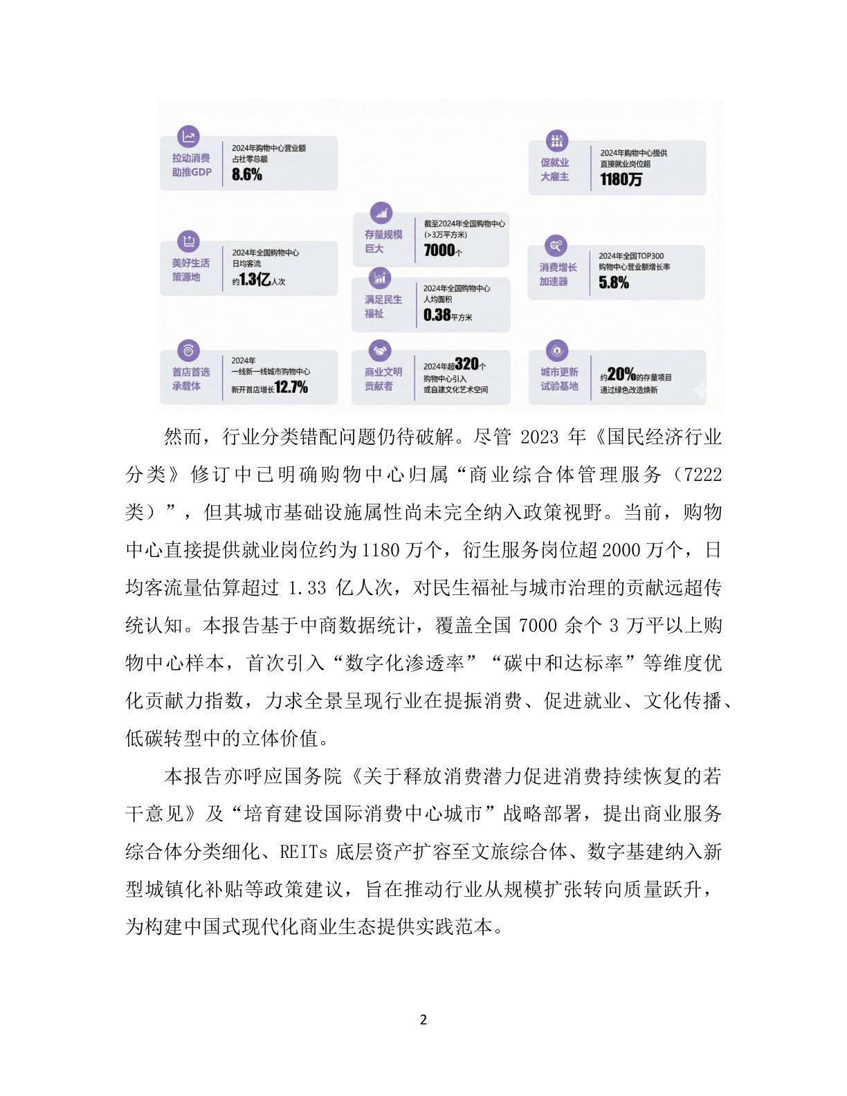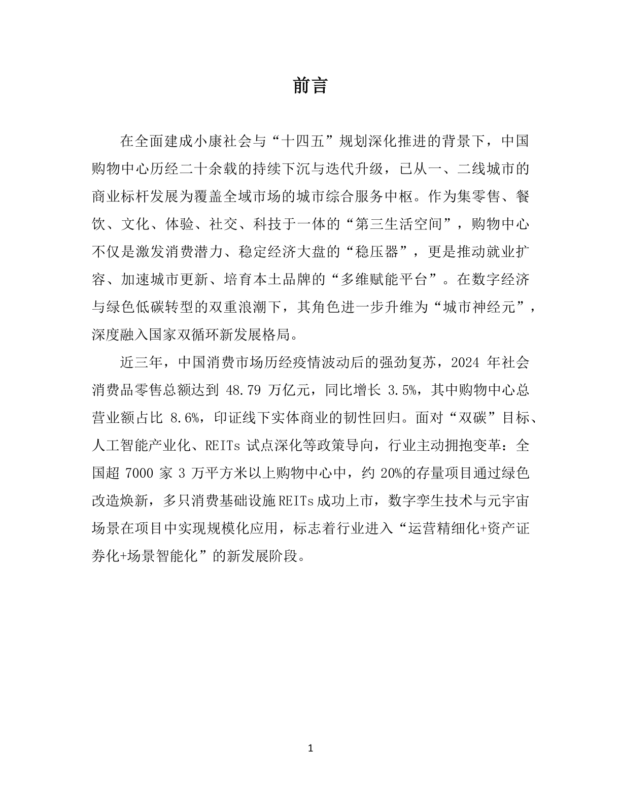 导读:报告聚焦中国购物中心的多元价值,基于全国 7000 余个 3 万平方米以上项目样本,系统呈现其对经济社会的综合贡献。2024 年,全国购物中心营业额达 4.2 万亿元,占社会消费品零售总额 8.6%,直接提供就业岗位 1180 万个,衍生岗位超 2000 万个,日均客流超 1.33 亿人次,成为稳定内需与就业的核心支柱。购物中心功能持续升级,从零售终端转型为 “第三生活空间”。超 320 个项目引入文化艺术空间,首店数量增长 12.7%,20% 存量项目通过绿色改造焕新,数字化与绿色低碳转型成效显著。在城市更新中,购物中心通过存量改造、片区赋能等模式,激活老旧城区活力,重塑城市空间价值。五大国际消费中心城市中,上海以 93.5 分位居贡献力指数榜首,深圳、北京紧随其后。报告提出应明确购物中心消费基础设施定位,优化土地、金融、税收政策,推动行业从规模扩张向质量提升转型,持续释放其在消费促进、文化传播、民生保障等领域的综合价值。