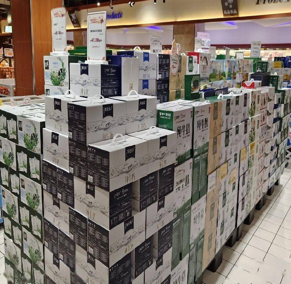 常温奶的奶堆怎么陈列更有效果?第一层手线的位置在1.2m;第二层手线的位置在1.4m;最高层眼线的位置在1.6m;主打商品做重点展示面陈列;展示面内部以塑料筐做假底进行填充;奶堆正面做立式价格标签说明牌,标注原价以及促销价格。
