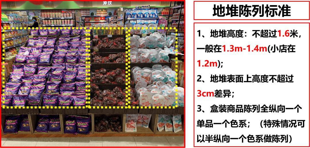 暗线:货架最上方的第一层每个单品的排面数与倒数第一层以上各层板的单品数量一致,确保商品线条不错位,采用2对3,4对5等多种方法保证商品线整齐。