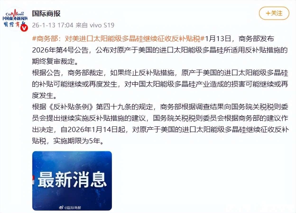 1月13日,中国商务部发布公告,延续对美国和韩国相关产品的反倾销税,实施期长达五年。这项公告看似只是延续多晶硅反倾销税,但实则是一记早已准备好的战略性反击。多晶硅是太阳能电池制造中不可或缺的基础材料,过去十年间,美国和韩国的企业通过低价倾销,挤压了中国本土多晶硅生产商,使得中国的43家企业中仅剩8家勉强维持运营。