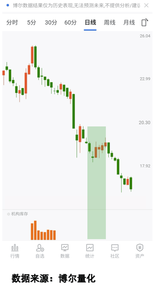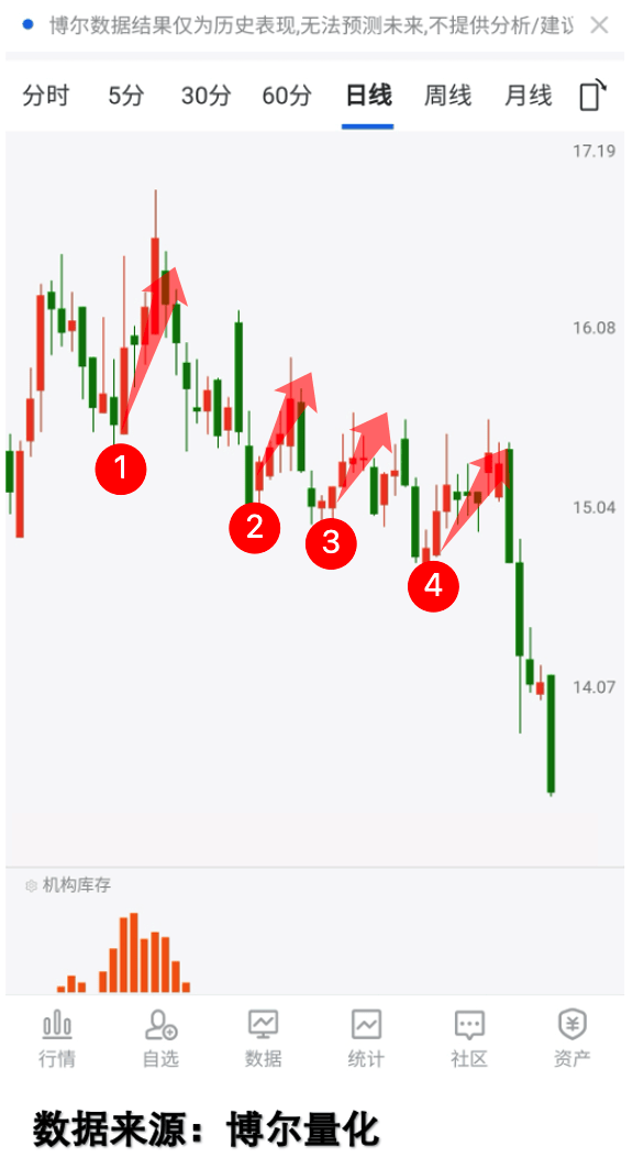 这只股票连续四天价位飘红,但「机构库存」一直没出现,说明机构没参与这次回升,后面果然继续下探,要是光看走势进场,又要踩坑。所以用量化数据做标尺,就能轻松分辨回升的真伪,不用再靠感觉赌运气。