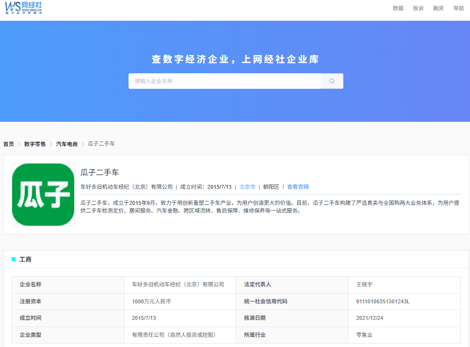 据网经社企业库显示,“瓜子二手车”属于车好多旧机动车经纪(北京)有限公司,成立于2015年7月13日,法定代表人为王晓宇。瓜子二手车自称致力于用创新重塑二手车产业,目前构建了严选直卖与全国购两大业务体系,为用户提供二手车检测定价、居间服务、汽车金融、跨区域流转、售后保障、维修保养等一站式服务。