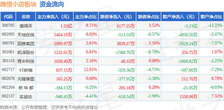 从资金流向上来看,当日微信小店板块主力资金净流入2.5亿元,游资资金净流入6833.82万元,散户资金净流出3.18亿元。微信小店板块个股资金流向见下表:
