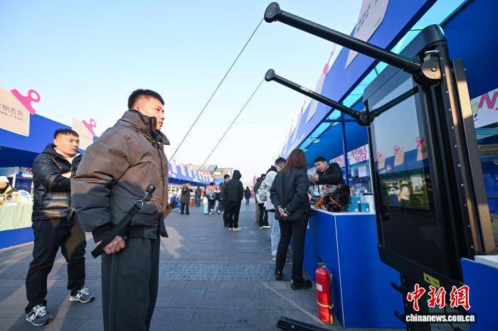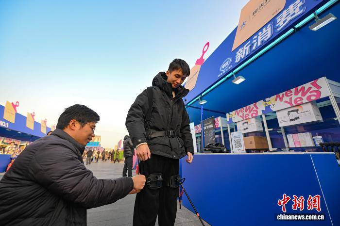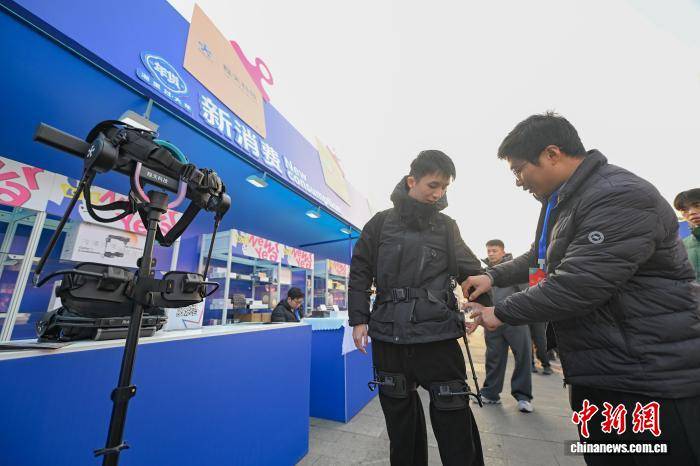 1月23日,市民体验外骨骼机器人。当日,2026浙江新春消费季主场活动在杭州举行,8个主题展区的近300个品牌亮相。外骨骼机器人、智能眼镜、无人机等科技“新年货”吸引民众关注。中新社记者 王刚 摄