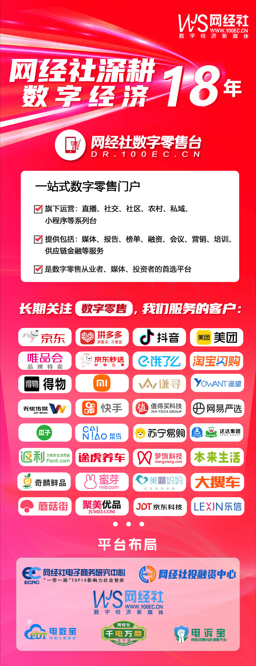 网经社数字零售台是一站式数字零售门户,旗下运营:直播、社交、社区团购、农村、生鲜、汽车、二手、母婴等系列频道,提供包括:媒体、报告榜单、融资、会议、营销、培训、供应链融资等。