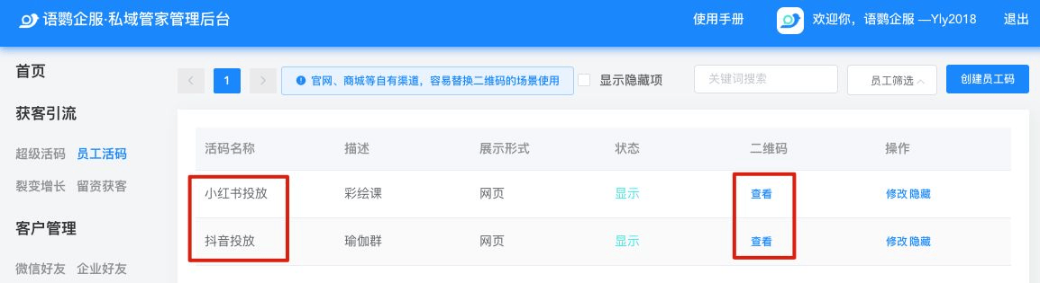 按照第一步多建几个员工活码,点击「查看」并保存员工活码,可以对应投放至线下教育培训机构门店、公众号等渠道进行客户的引流。