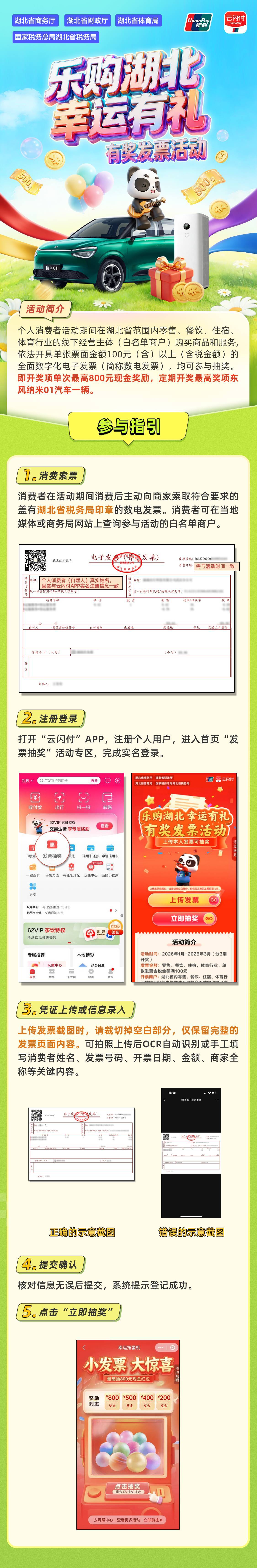 为贯彻落实《乐在湖北 ‘马’上有喜”新春消费季活动方案》,充分发挥财政资金引导带动作用,进一步激发新春消费需求,释放新春消费活力,我省于1月24日至3月31日面向在鄂来鄂消费者开展“乐购湖北 幸运有礼”有奖发票活动。