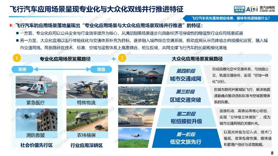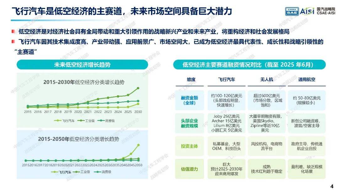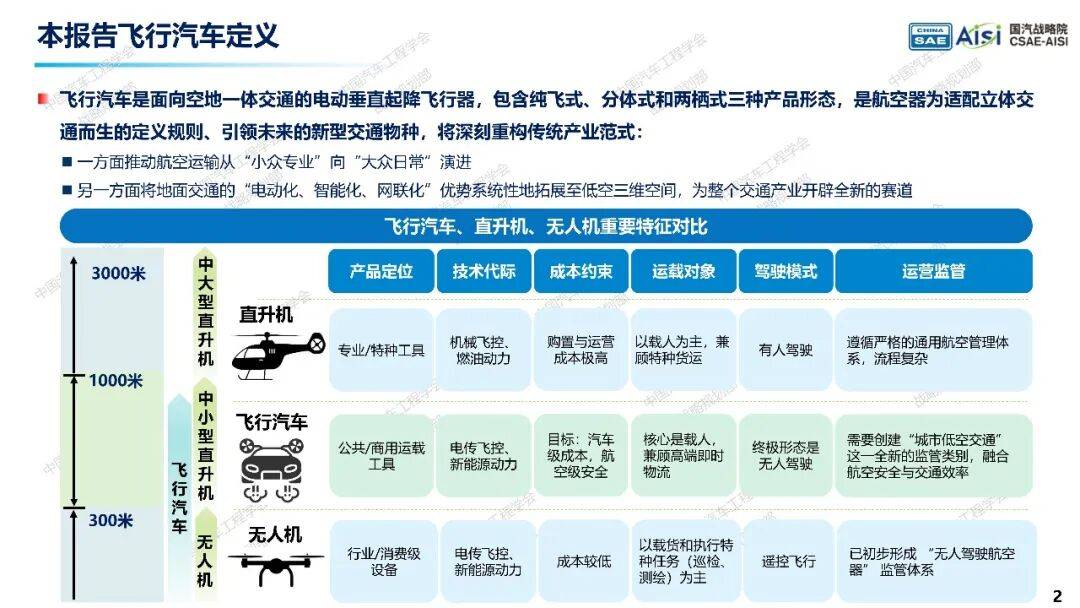 飞行汽车是未来空地一体交通的重要组成部分,将推动航空运输大众化,并将地面交通的电动化、智能化优势拓展至低空领域。飞行汽车分为纯飞式、分体式和两栖式三种形态,具有广阔市场潜力,预计将成为低空经济的“主赛道”。