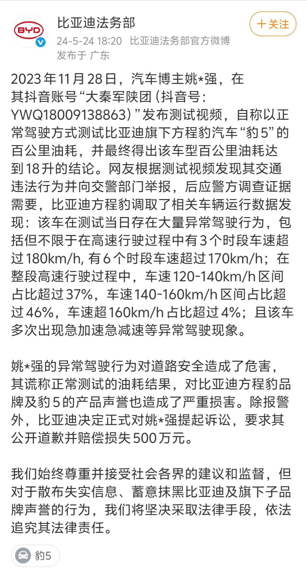2023年12月,方程豹豹 5 上市之际,姚*强通过抖音账号“大秦军陕团”发布视频,声称以正常驾驶方式测试方程豹旗下车型豹5,得出百公里油耗18升的结论,在网络上引起了大范围的关注及讨论。之后应警方调查取证需要,比亚迪调取数据显示:测试当日车辆存在大量异常驾驶行为,高速行驶过程中有3个时段车速超过180km/h, 有6个时段车速超过170km/h,在整段高速行驶过程中,车速120-140km/h区间占比超过37%,车速140-160km/h区间占比超过46%,车速超160km/h占比超过4%。