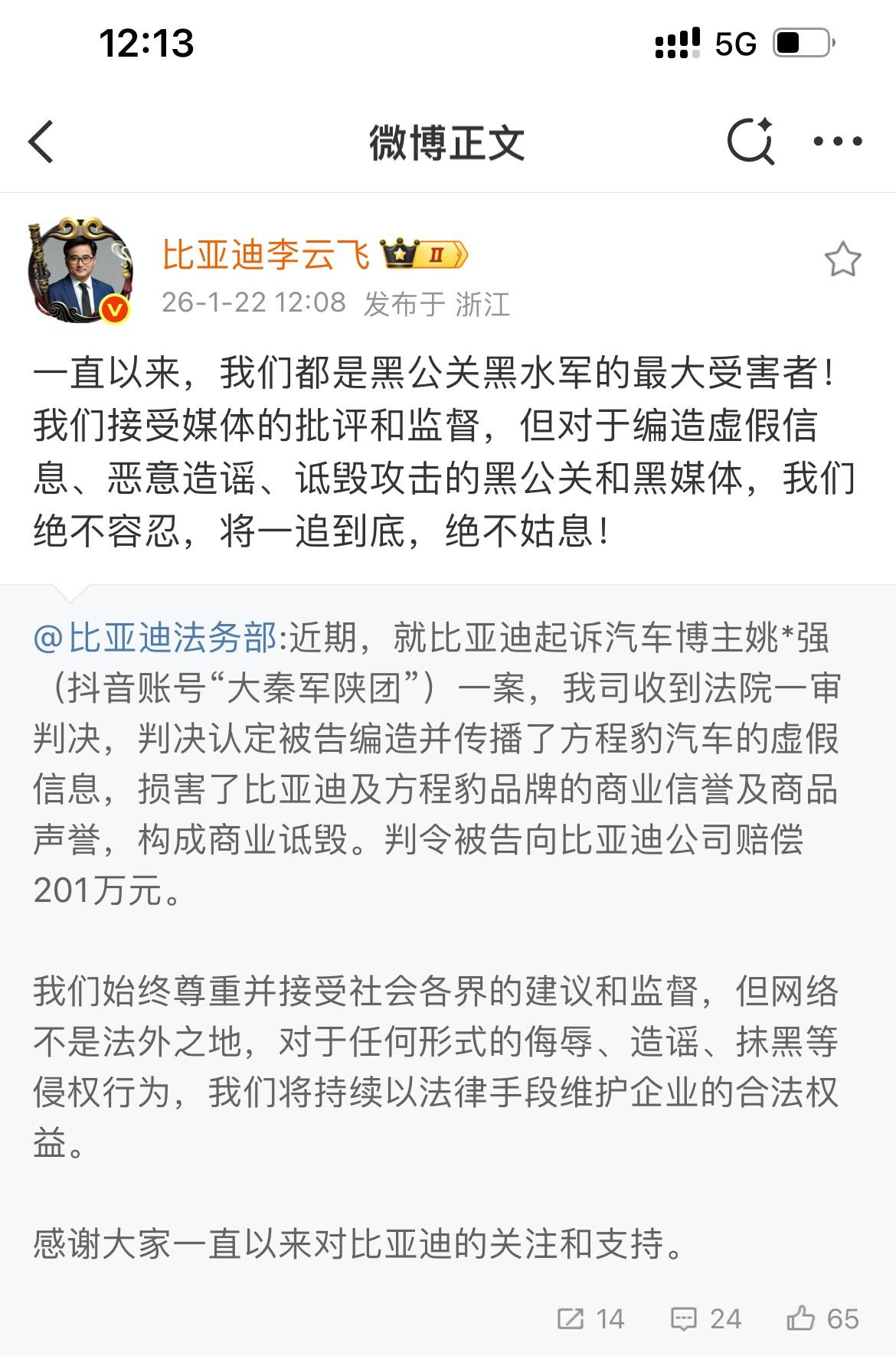 就比亚迪起诉姚*强(抖音账号“大秦军陕团”)一案,比亚迪坚持依托法律维护自身合法权益,并于近期公告案件胜诉。1月22日比亚迪法务部发布公告披露,法院判决认定被告编造并传播了方程豹汽车的虚假信息,损害了比亚迪及方程豹品牌的商业信誉及商品声誉,构成商业诋毁。判令被告姚*强向比亚迪公司赔偿201万元。随后,比亚迪集团品牌及公关处总经理李云飞转发该公告并表示:“一直以来,我们都是黑公关黑水军的最大受害者!我们接受媒体的批评和监督,但对于编造虚假信息、恶意造谣、诋毁攻击的黑公关和黑媒体,我们绝不容忍,一追到底,绝不姑息!”