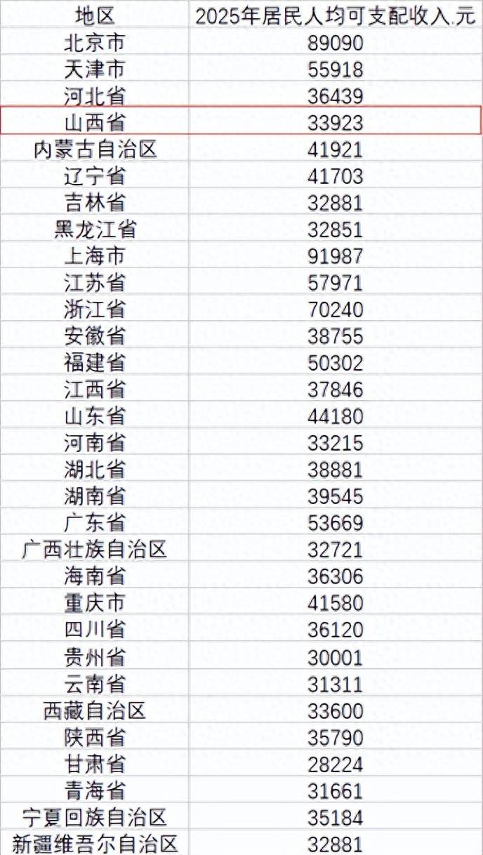 国家统计局网站公布了31个省份2025年居民人均可支配收入情况。数据显示,去年7个省份居民人均可支配收入超过了5万元。山西省2025年居民人均可支配收入为33923元。