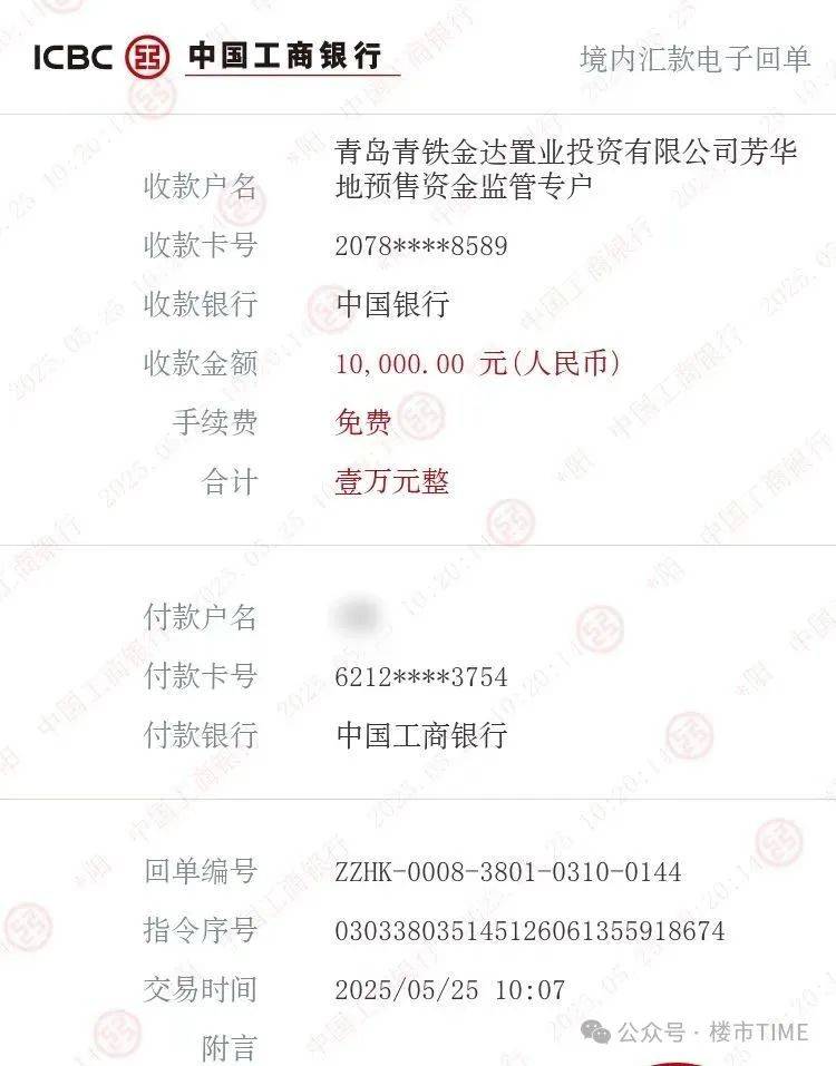 “我于2025年5月25日认购了青岛青铁金达置业投资有限公司开发的位于青岛市李沧区金水路301号的“青铁·芳华地”项目10号楼1单元602房,支付房款合计5万元,支付款项后,青岛青铁金达置业投资有限公司至今未开具任何收款收据,严重违反法律法规,侵害消费者权益,特此投诉。”
