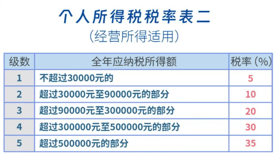 根据《中华人民共和国个人所得税法》第三条及第六条,经营所得,以每一纳税年度的收入总额减除成本、费用以及损失后的余额,为应纳税所得额,使用百分之五至百分之三十五的超额累进税率。