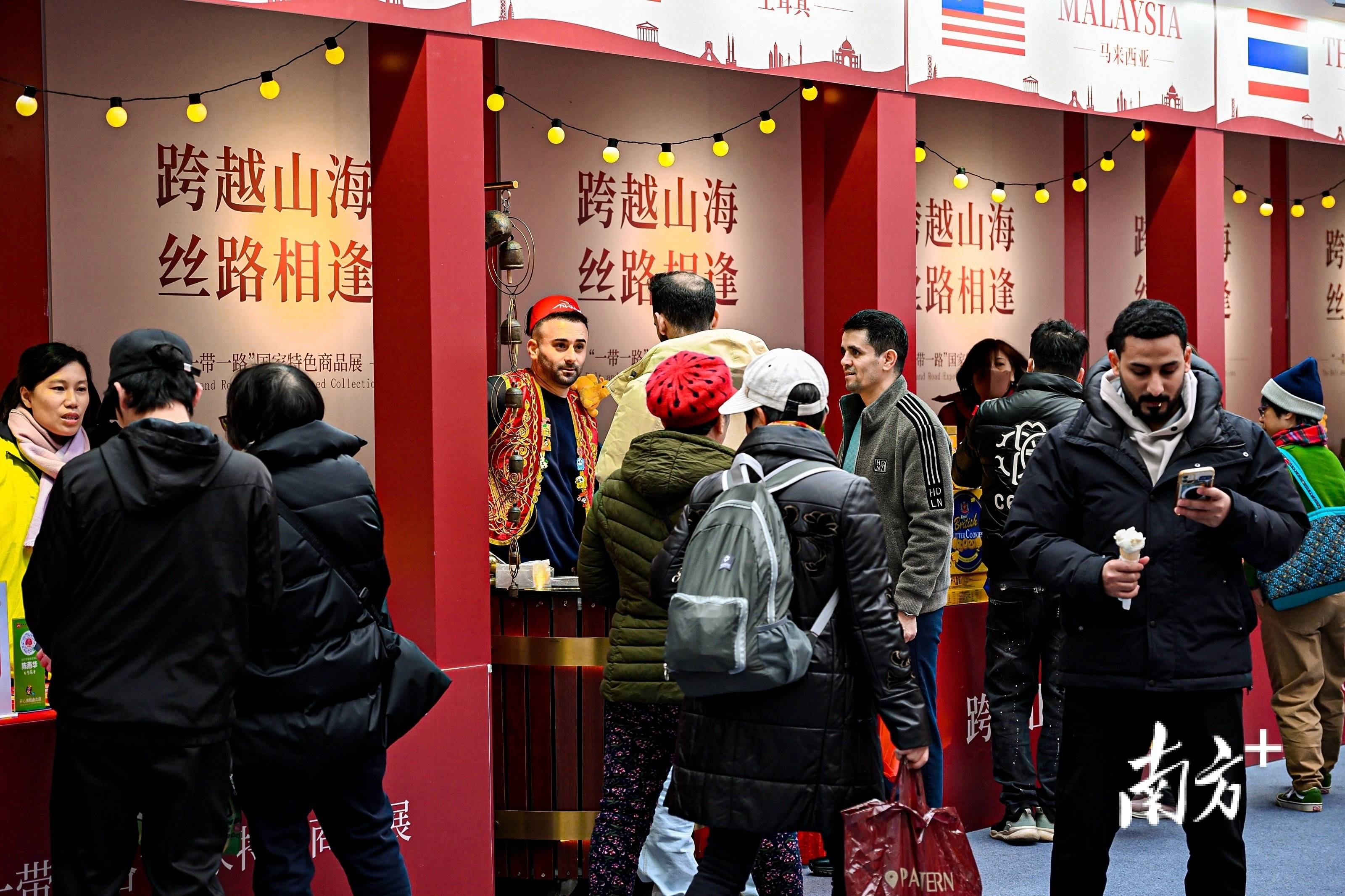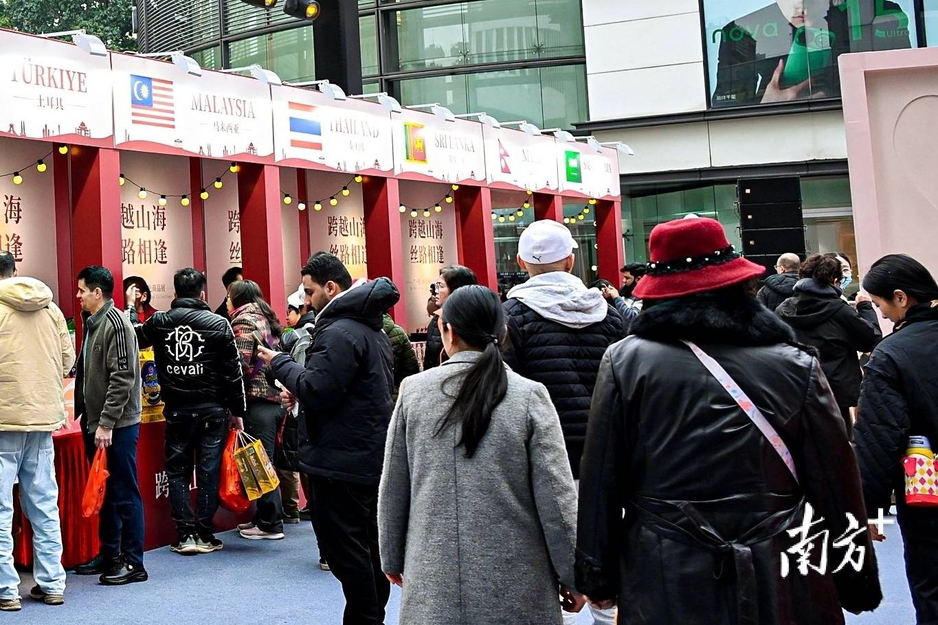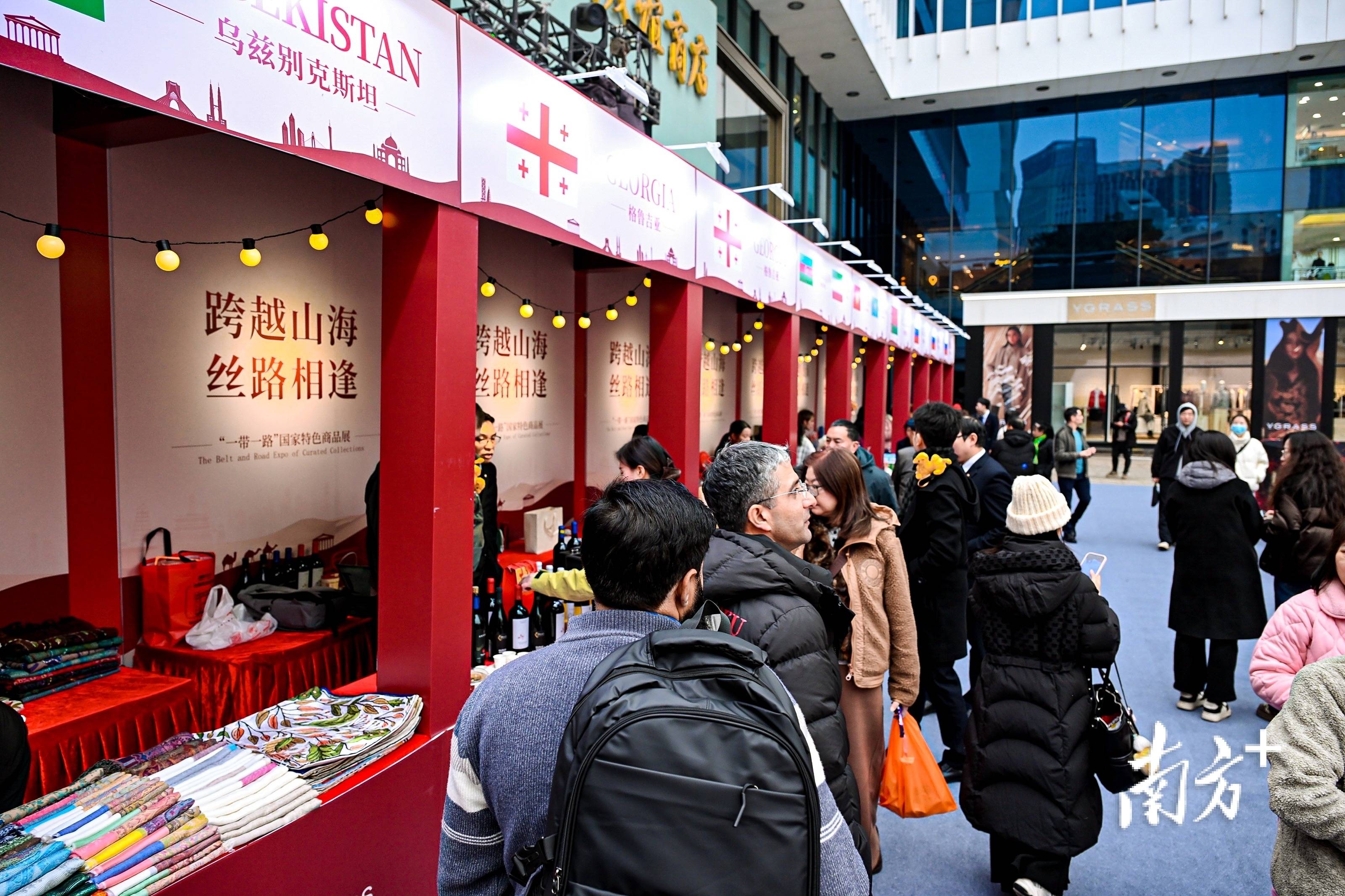 在商场中央广场,来自俄罗斯、白俄罗斯、哈萨克斯坦、尼泊尔、乌兹别克斯坦等多个“一带一路”共建国家的特色商品汇聚于16个国家特色摊位,沿陆海丝路脉络展开,让市民足不出穗即可“一站式”购全球、赏风情。