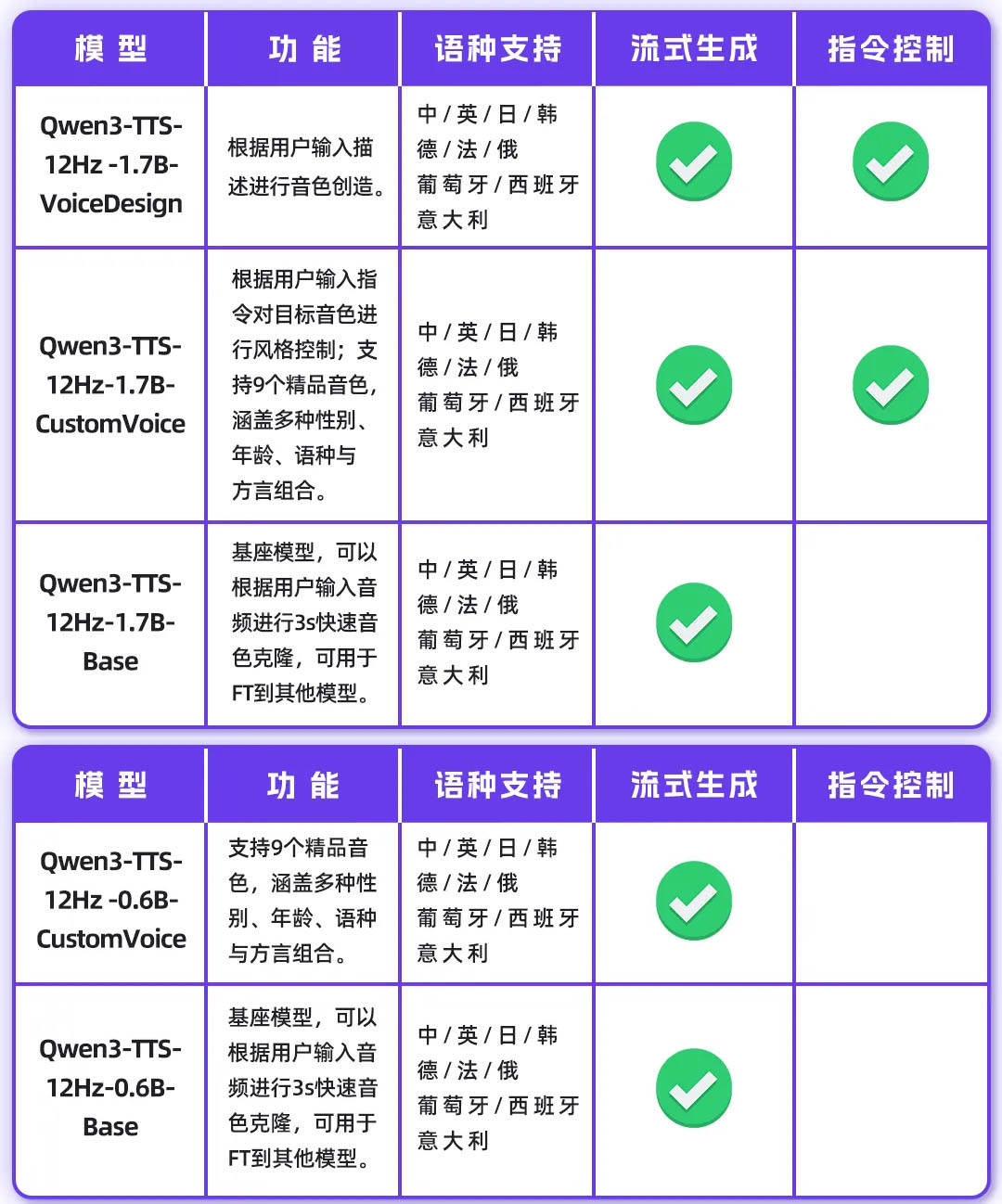 近日,千问 Qwen 宣布 Qwen3‑TTS 全系列语音生成模型正式开源,覆盖 1.7B 与 0.6B 两种尺寸,并支持音色克隆、音色创造、情感与韵律控制、多语种生成等完整语音能力。