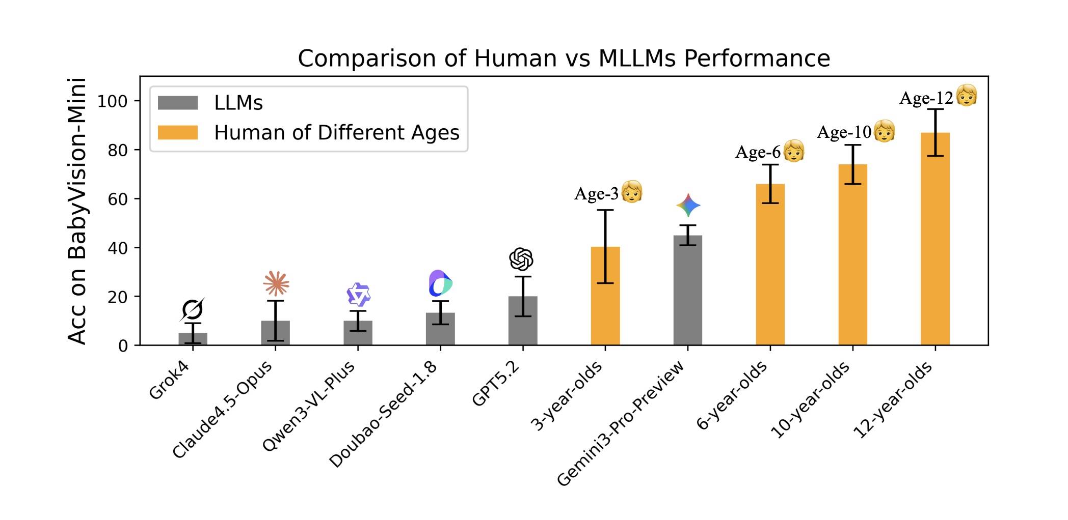 据量子位报道,多家研究机构最新发布的 BabyVision 视觉推理基准结果显示,当前最强多模态模型在视觉推理方面的表现,仍显著落后于人类儿童水平。