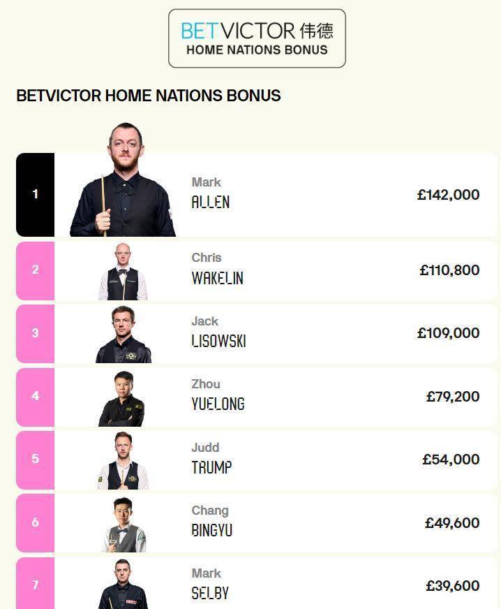 赛事总奖金分布显示:32强选手可得5400英镑,64强获3600英镑,96强获1000英镑。 资格赛晋级的中国选手除奖金外,还在排名积分上有所收获,为后续冲击世界大奖赛席位奠定基础。