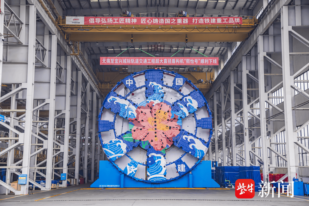 “熙怡号”开挖直径14.02米,整机长120米,重约3200吨,将承担竺山湖西至竺山湖东工作井区间约7.6公里隧道掘进,最大埋深34.88米。其刀盘涂装融合无锡市花杜鹃花与太湖水纹元素,寓意盾构机以独特的“钢铁之花”为先锋,以柔克刚,破土穿岩,势若潮涌般势不可挡,游刃有余地在复杂地层中智慧穿行。