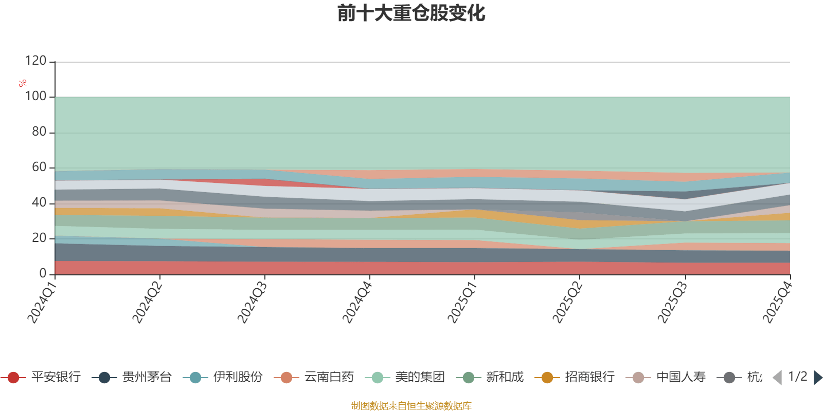 该基金持股集中度较高,且持股标的较为稳定。截至2025年四季度末,基金十大重仓股分别是新和成、贵州茅台、平安银行、中信证券、宁波银行、兴业银行、美的集团、中国人寿、云南白药、招商银行。