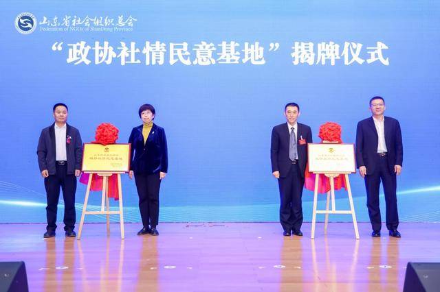 济南市政协副秘书长、研究室主任张伟超,总会党委书记、会长王安忠共同为“山东省社会组织总会政协社情民意基地”揭牌。济南市历下区政协党组副书记、副主席王莹、山东科技咨询协会常务副理事长魏正杰共同为“山东科技咨询协会政协社情民意基地”揭牌。