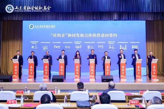 井坤副会长与山东省注册会计师协会、山东省明日之星教育基金会、山东科技咨询协会、山东省大数据协会、山东省中小企业服务联合会、山东省卫生保健协会、山东省装备制造业协会、山东省省会经济圈产教联合体、山东省钢铁行业协会等2026“社校企”协同发展合作伙伴代表进行签约。