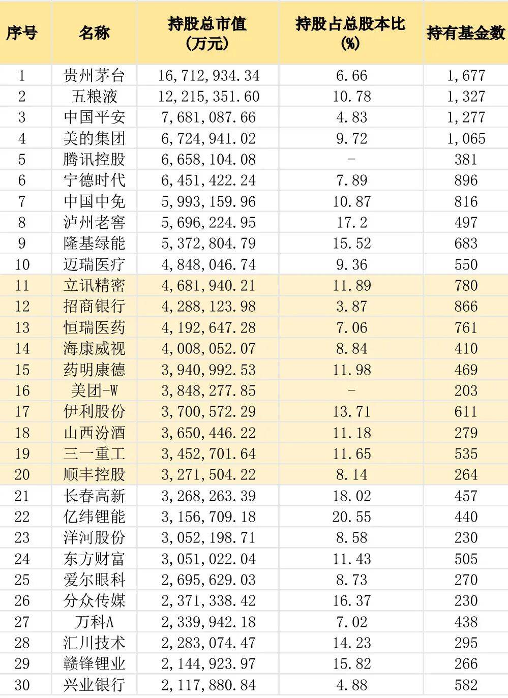 在公募基金前五十大重仓股名单中,还包括工业富联、寒武纪、沪电股份、东山精密、胜宏科技、深南电路、生益科技、兆易创新等AI相关概念股。与之相对应的是,不少传统行业明星股,正在持续淡出公募重仓股名单。此前多年霸屏公募“最爱”的贵州茅台,险些跌出公募持仓前十名。