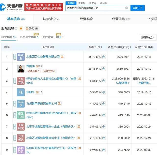 同步工商信息显示,西贝餐饮的注册资本从8990.29万元增至10168.01万元,增幅约13.1%。股东名单中,西贝餐饮创始人贾国龙持股比例下降为26.1644%,仍为公司实控人。